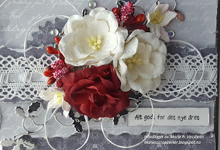 Lykten med klokke er en chipboard fra SnipArt, og teksten er en stempeltekst fra Kort og Godt. Tag'en er klippet ut fra utklippsarket, og bak har jeg lagt en doilie.